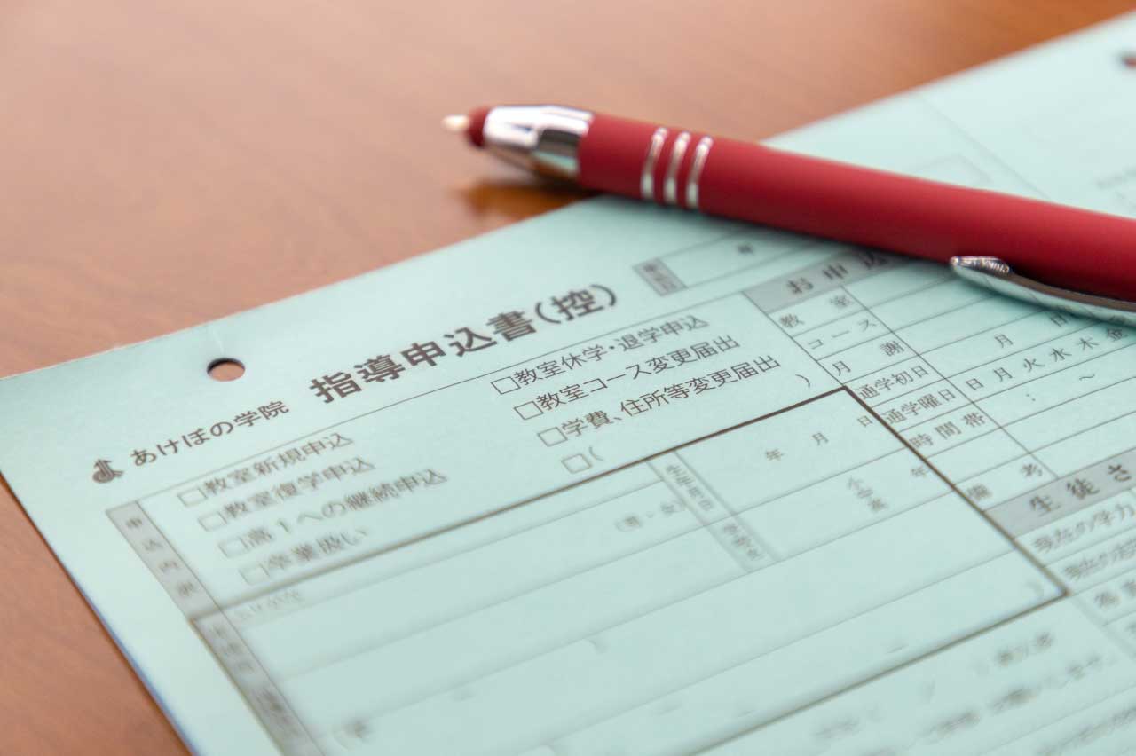 あけぼの学院では入学にあたり、やる気の確認と学力チェックのため、生徒さん・保護者様・担当指導員による面談を行い、成績や志望校などをふまえ、学力を伸ばすための具体的提案をさせていただきます。入学を希望される場合は必要書類をご記入いただき、手続き完了後入学となります。また、ご希望の方には70分の個別指導(2,000円(税込))を実際に体験いただくことも可能です。